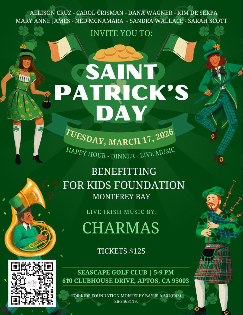 For Kids Foundation Monterey Bay is hosting a St Patrick’s Day party in honor of our collective Irish Heritage. This family-friendly fundraiser event includes singalong songs for all ages, nostalgic oldies, pint-lifting pub songs, ceili music, and Celtic rock for dancing after dinner. Kick off your shoes and dance some jigs with Charmas full 5-piece band.